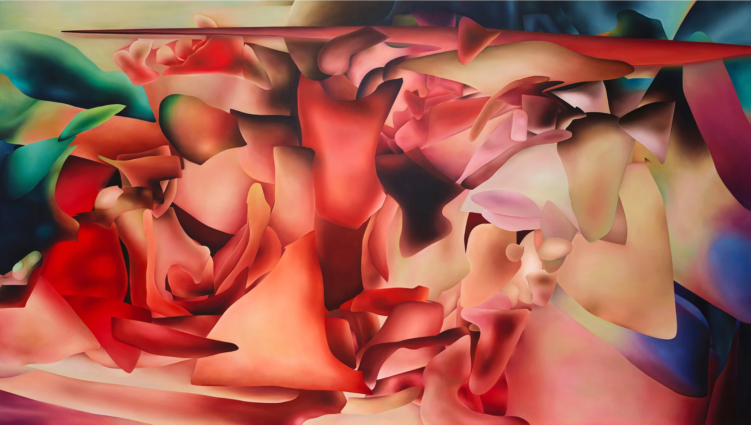 Angela Santana, Speaking in Tongues, 2024, Oil on canvas. 65 1/2 × 116 in. Image courtesy of the artist.