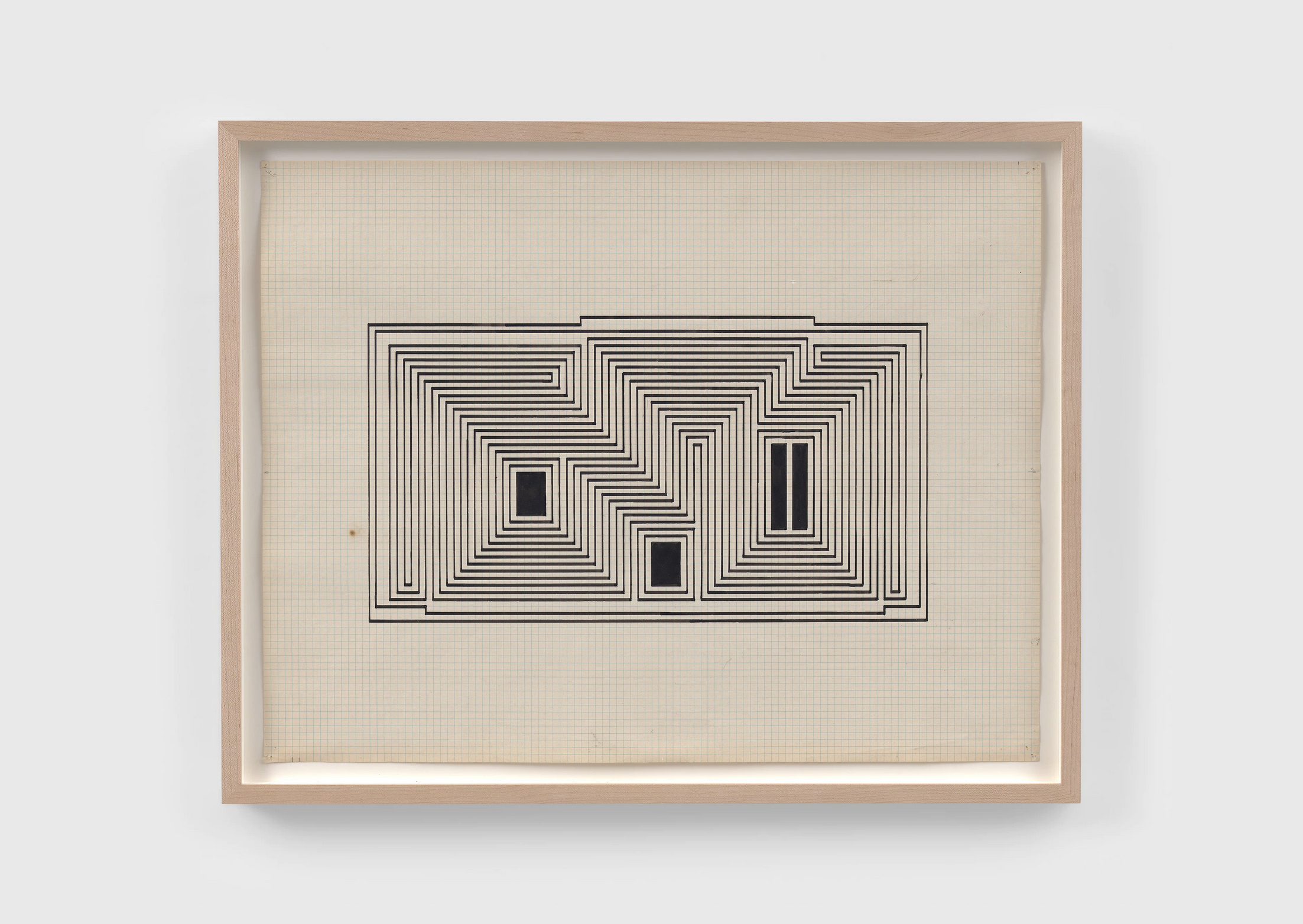 The minimalism of a single maze-like diagrammatic drawing - rendered with a rule - on finely gridded paper - bowing in its light wooden frame - as if still tacked to a studio wall reminds us of the theorist and educator in Albers - whose working renderings are like a mathematician’s calculations and by no means the conclusion.